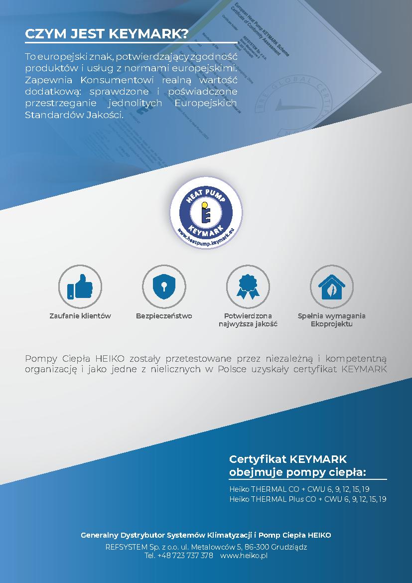 Pompy Ciepła HEIKO THERMAL oraz THERMAL Plus spełniły wysokie standardy jakości i uzyskały prestiżowy certyfikat KEYMARK.