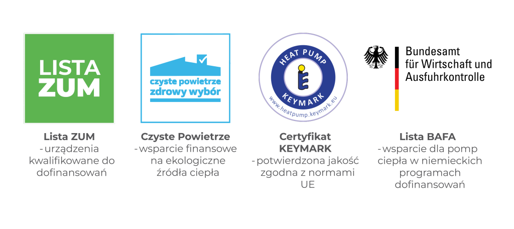 Urządzenia zostały wpisane na oficjalną Listę Zielonych Urządzeń i Materiałów (ZUM), dzięki czemu kwalifikują się do programu Czyste Powietrze i innych systemów dofinansowań. Pompy ciepła HEIKO posiadają również prestiżowy certyfikat KEYMARK, potwierdzający zgodność z europejskimi normami jakości i efektywności energetycznej, oraz wpis na niemiecką listę BAFA.